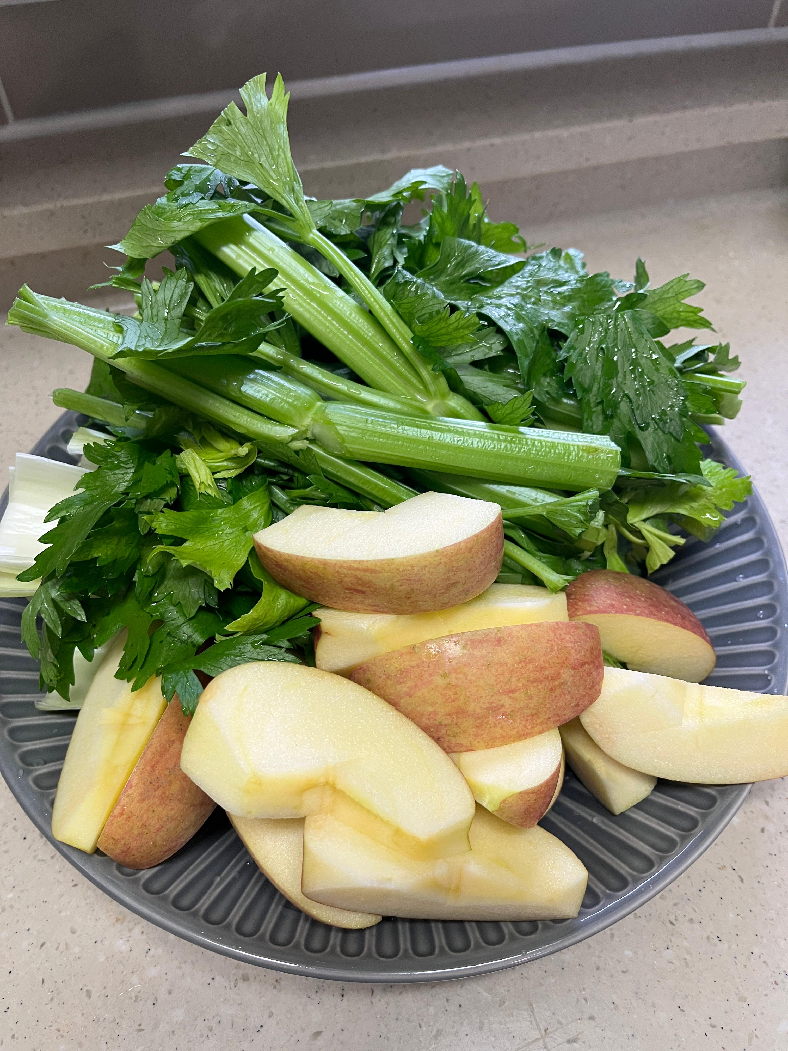 샐러리와 사과를 물에 담궈서 잔류 농약을 잘 씻어준후